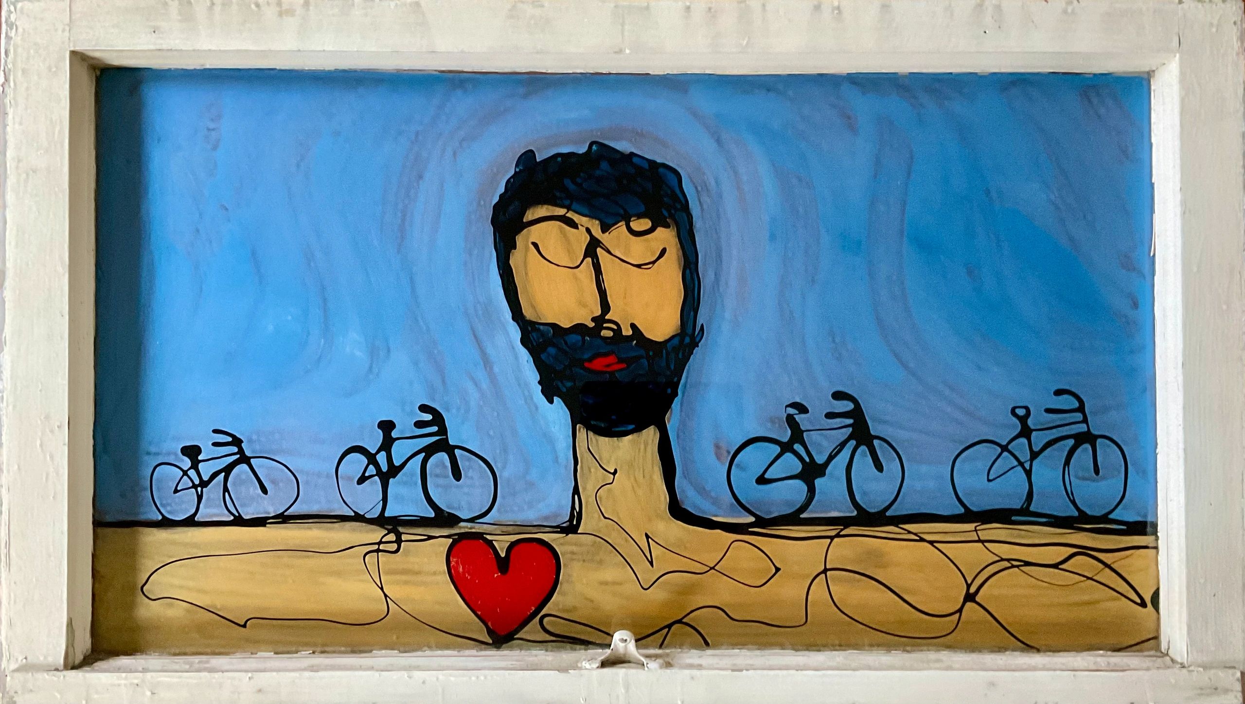 Patron saint of bicycle (21x36), Mixed media on old window