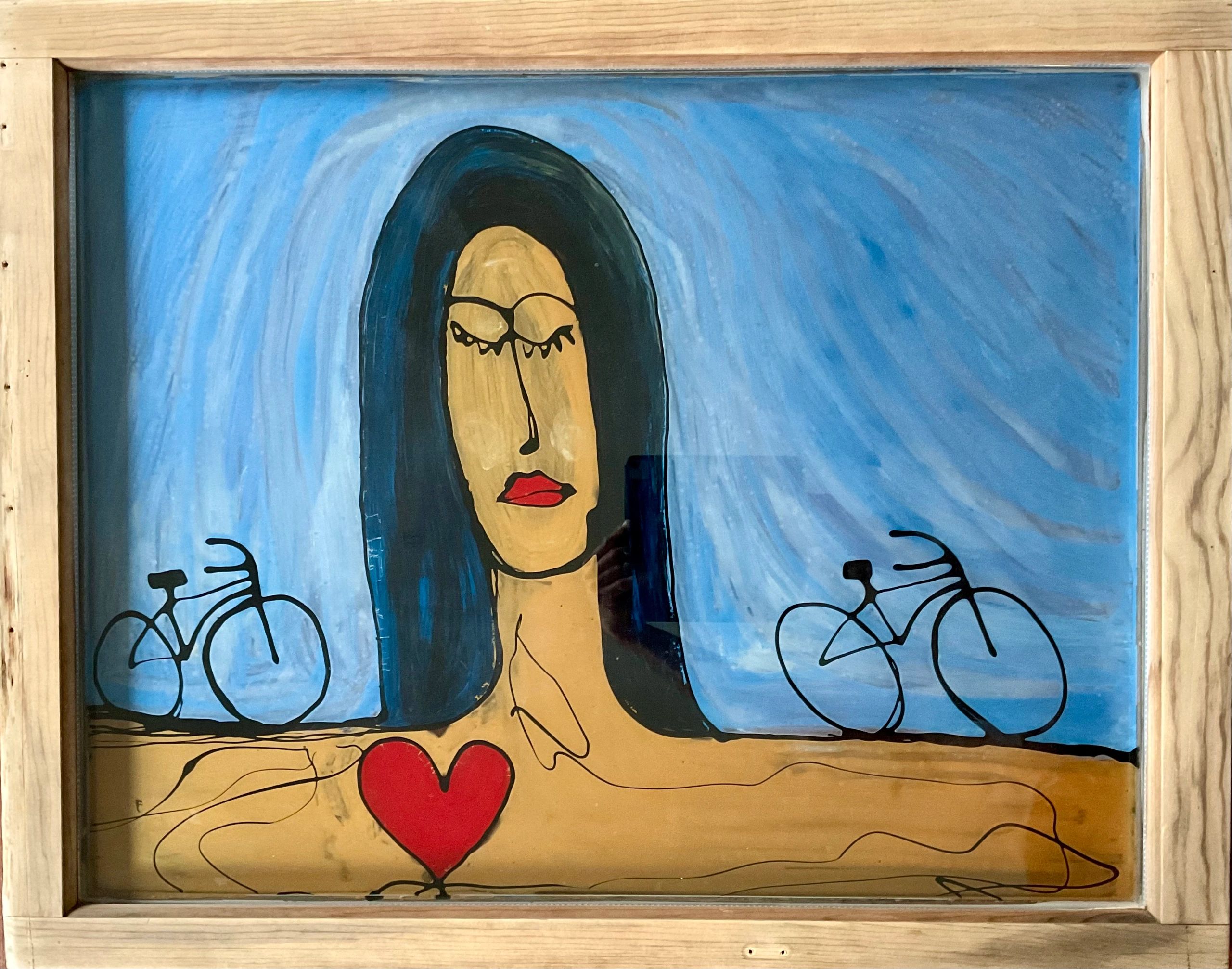 Goddess of bike (26x33), Mixed media on old window
