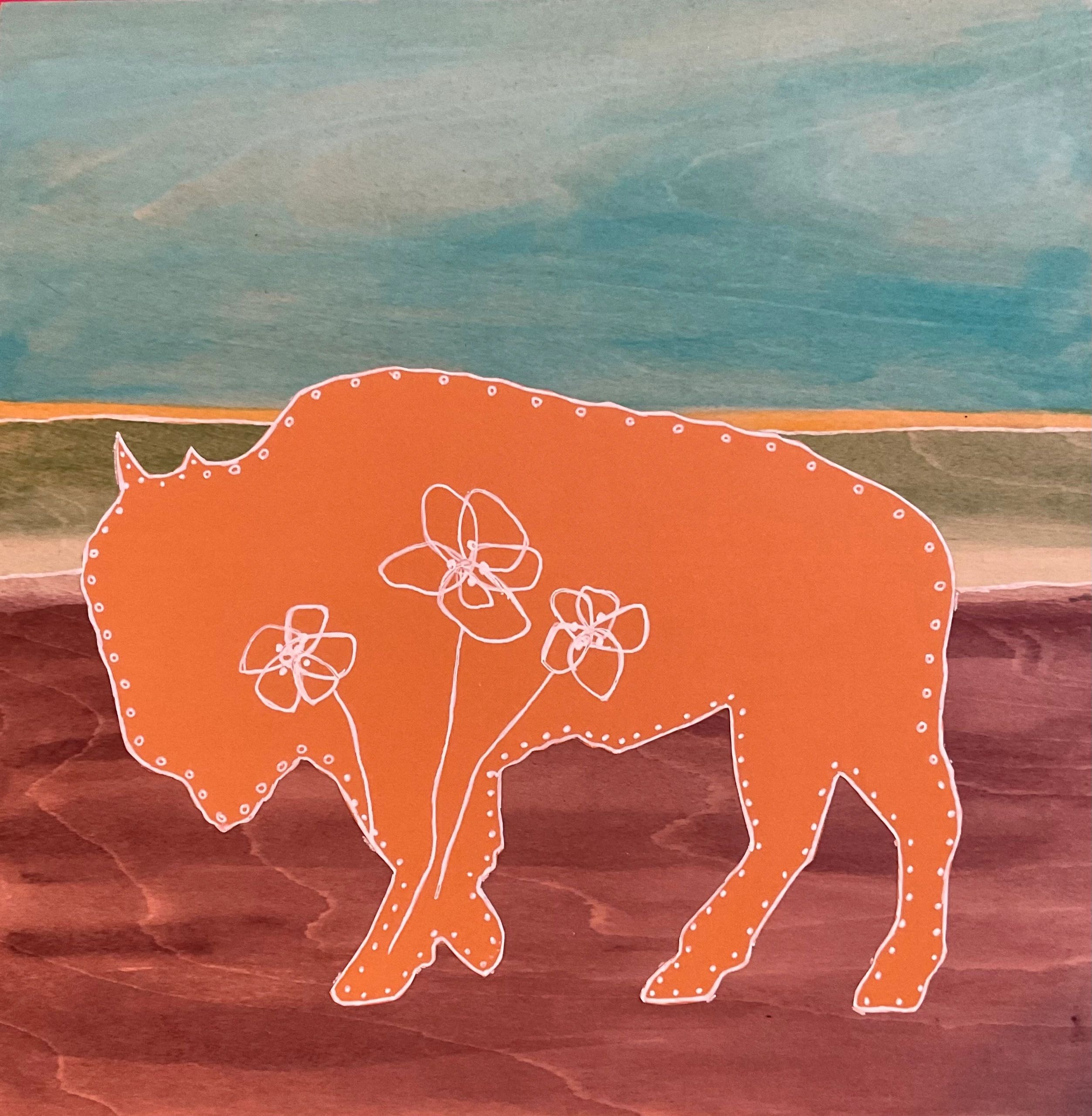 Flowered bison (6 x 6), mixed media on wood (Sold)