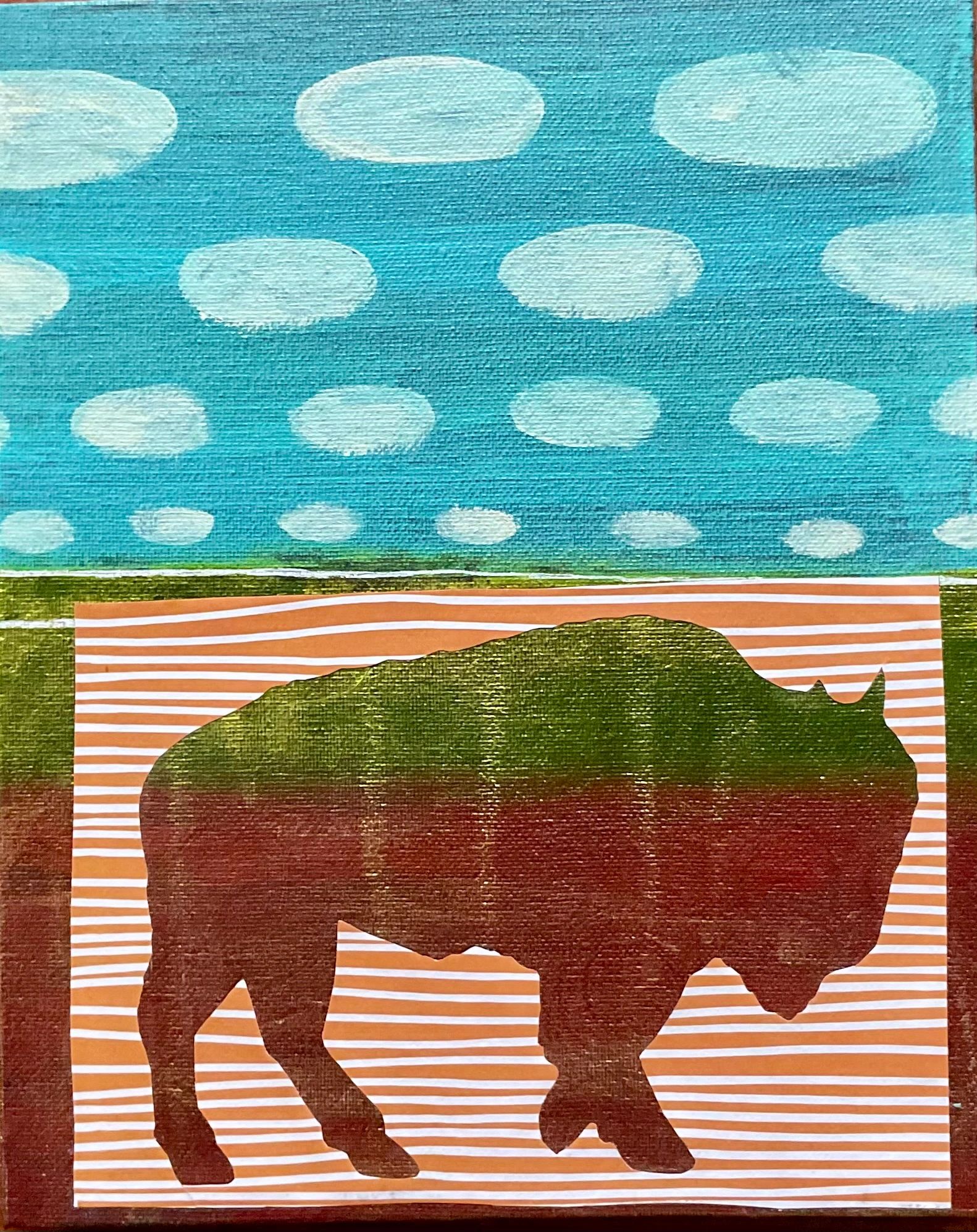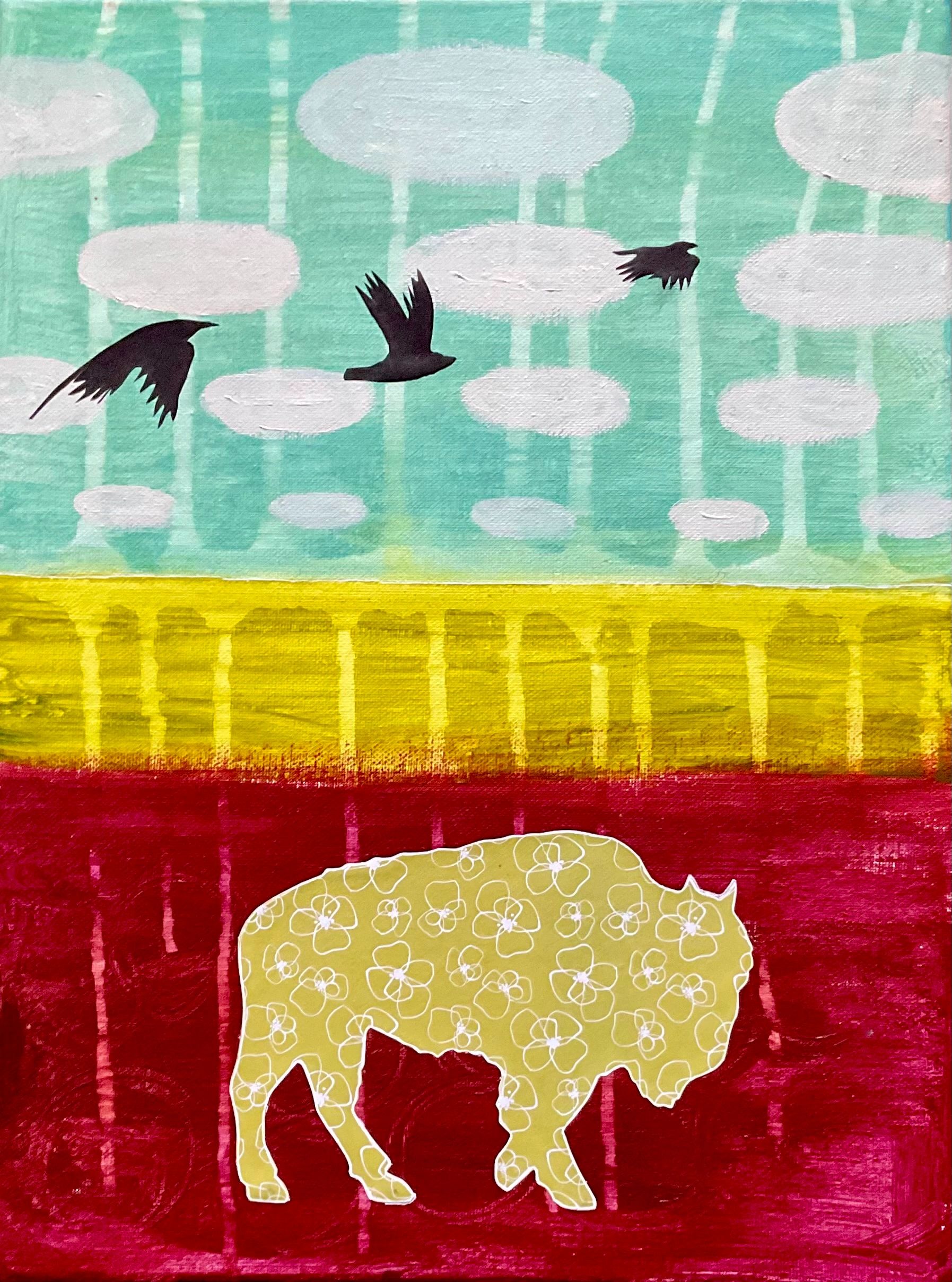 Flowered bison and crows (12 x 16), mixed media on canvas