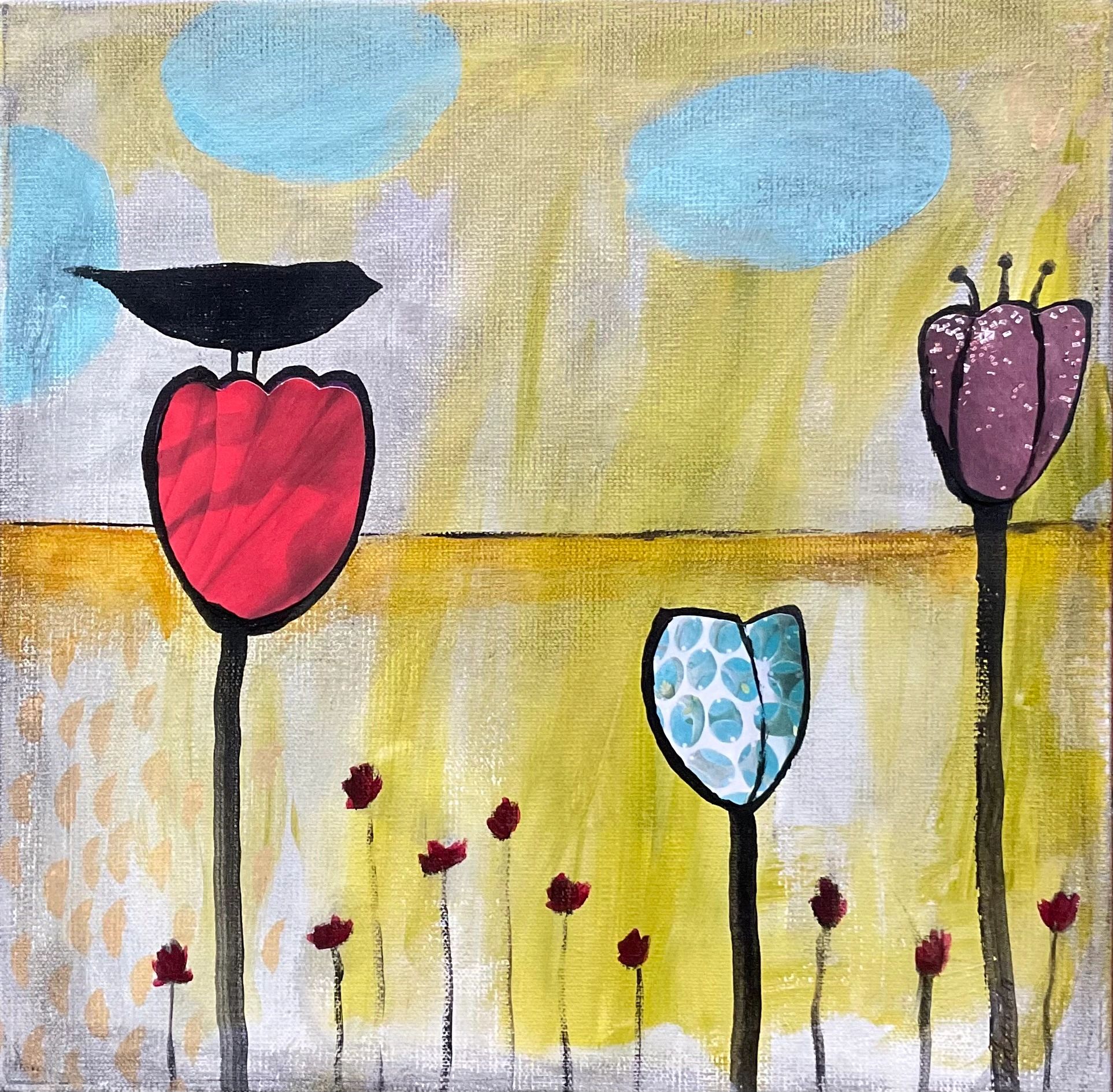 Hare and flower (6” x 6”), Mixed media on wood. (Sold)